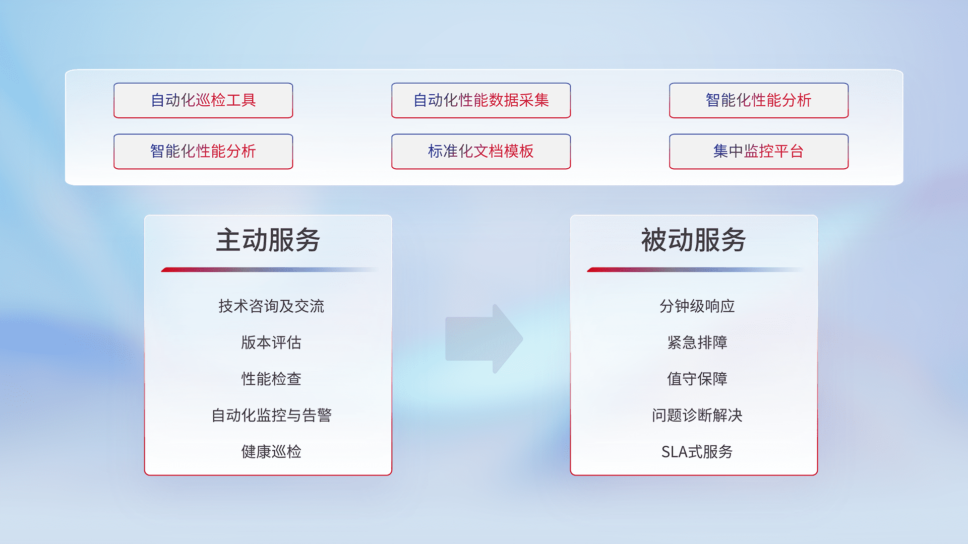 智能化工具和标准化文档,,保障服务质量,,提供主动服务(包含技术咨询、、版本评估、、、性能检查、、、、自动化监控与告警、、、健康巡检)和被动服务包含(分钟级响应、、、、紧急排障、、、值守保障、、问题诊断解决、、、SLA服务)。。。。