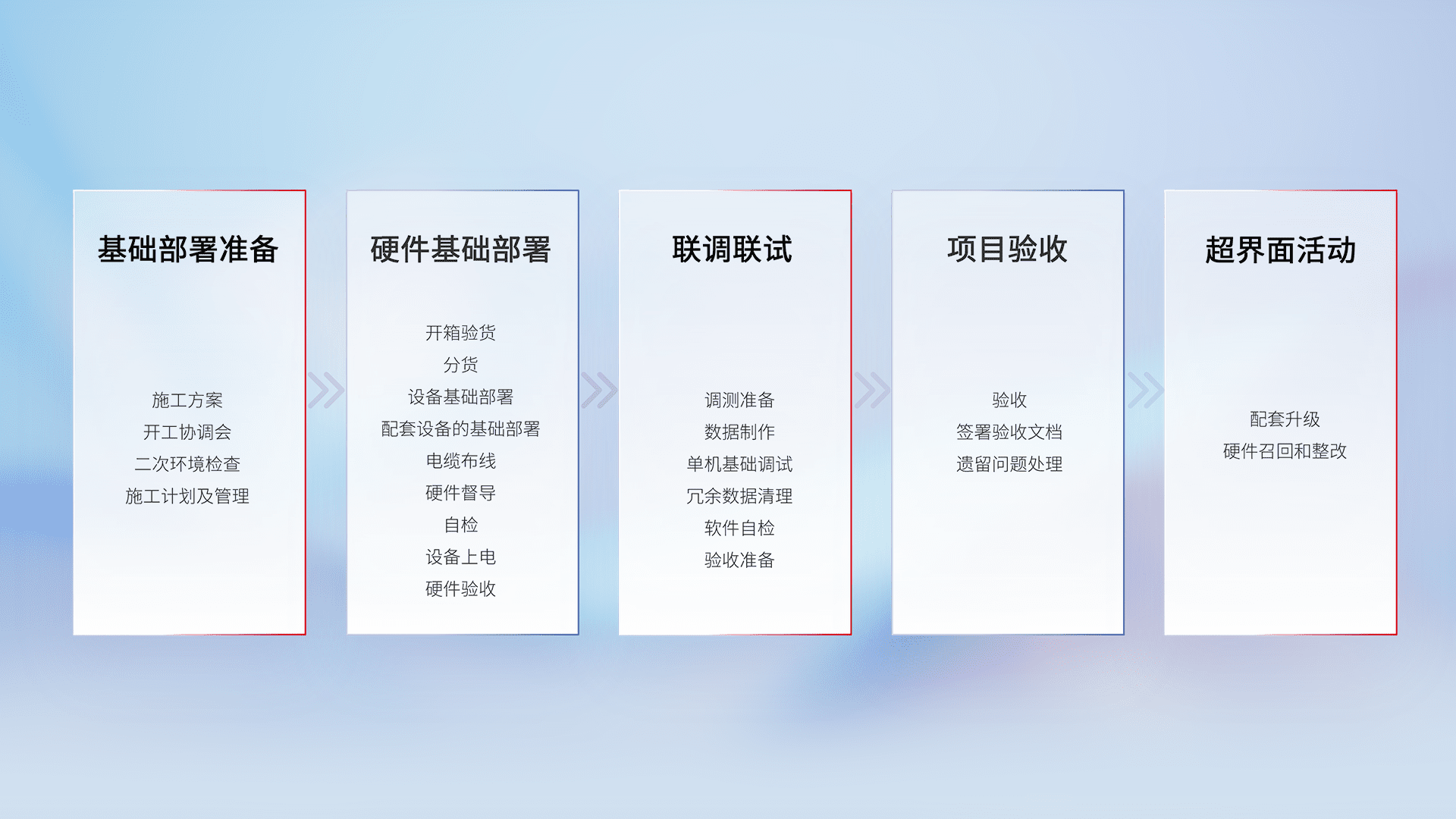 从基础部署准备、、、硬件基础部署、、联调联试、、项目验收、、、、越界面活动的全过程可追溯,,保证施工质量和进度。。。。